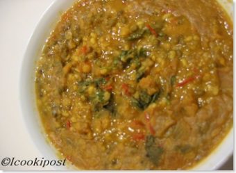 - pressure cook dal with turmeric powder and sufficient water until it is soft and broken.Add salt and stir well to prevent from sticking to the bottom .