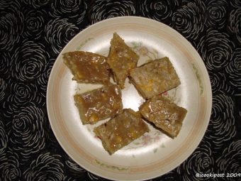 - When it starts thickening and leaves the sides of the pan, transfer it to a flat pan greased with ghee.