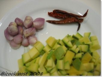 - Grind together mango,shallots,dry red chilly and salt into a paste.