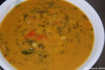 - Pressure cook toor daal, spinach, chopped tomato, sambhar powder, salt and required amount of water.